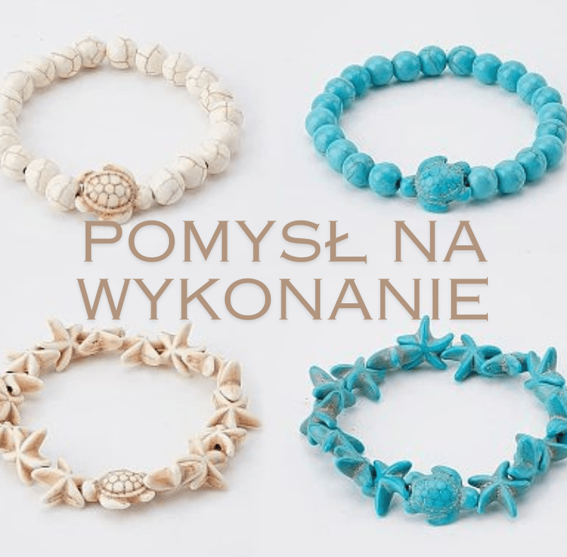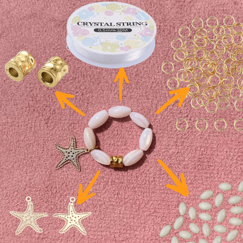 W skład wchodzą: koraliki rozgwiazdy, koraliki okrągłe, wiórki, muszelki cowrie, pojemnik na koraliki.