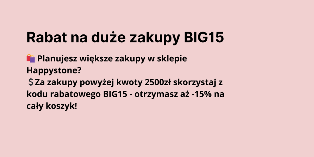 Jeśli suma Twoich zakupów w sklepie Happystone kwalifikuje się do otrzymania rabatu – napisz do nas na kontakt@happystone.pl – po weryfikacji przyznamy Ci stały rabat na zakupy w sklepie i otrzymasz indywidualny kod rabatowy. Pamiętaj, że zakupy muszą być robione z tego samego konta (emaila) abyśmy mogli zsumować łączną wydaną kwotę. Kod rabatowy przyznany dla Ciebie będzie również przypisany do Twojego emaila oraz konta.