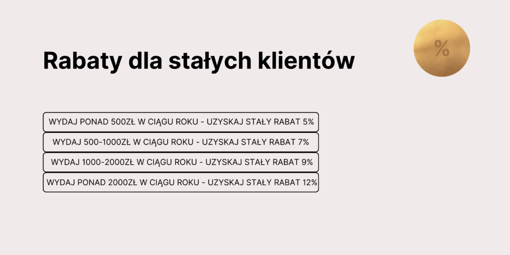 Wysokość Twojego rabatu opiera się na kwocie wydanej na zakupy na naszej stronie w ostatnim roku. Im więcej zamówień złożysz, tym większym rabatem będziesz mógł cieszyć się jako klient VIP.